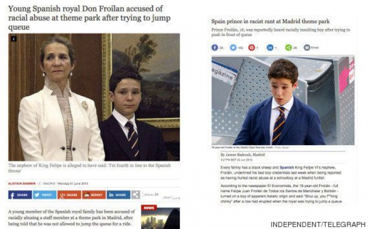 The Independent y en The Telegraph han sido los primeros en recoger el tema, del que también hablan algunos medios locales. "El joven miembro de la familia real española Froilán acusado de insultos racistas después de intentar colarse en el parque de atracciones", es el título de la noticia que el lunes publicaba el primero. The Telegraph ha preferido un titular más breve y se refiere a la "bronca racista" de un príncipe español.