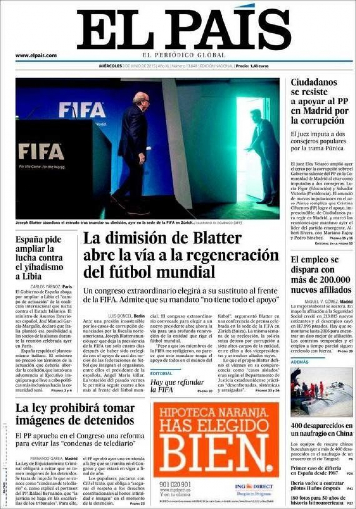 Hay pocas noticias que susciten la unanimidad de los medios, pero esta mañana asistimos a una de ellas: la dimisión de Joseph Blatter como presidente de la FIFA...