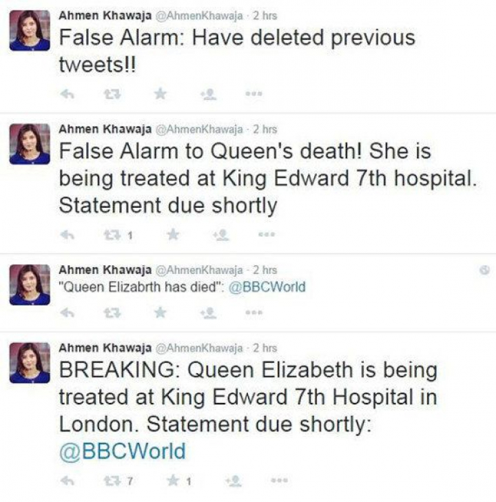 Esta mañana, la periodista Ahmen Khawaja ha publicado en Twitter: "ÚLTIMA HORA: La reina Isabel está siendo tratada en el hospital King Edward VII en Londres. @BBCWorld". Esta información no era del todo cierta, ya que la soberana estaba en el hospital para realizarse un chequeo anual completamente normal en vez de siendo tratada por alguna enfermedad, según han informado fuentes del Buckingham Palace. El tuit ha precedido a este otro en el timeline de Khawaja: "La reina Isabel ha muerto".