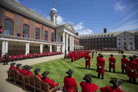 Varios pensionistas de Chelsea participan en la cabalgata del Día del Fundador en el Royal Hospital Chelsea en Londres, Inglaterra.