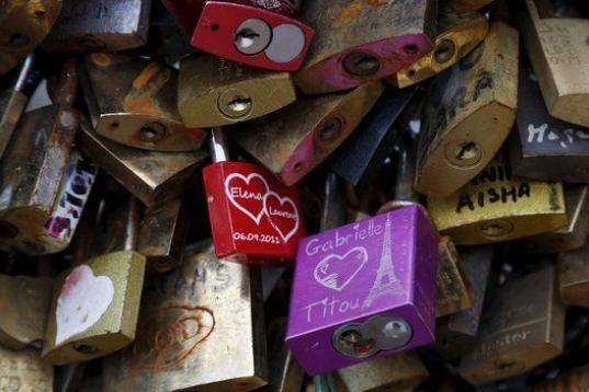 Una fotografía de cerca de los 'candados del amor' que estaban colgados en el Puente de las Artes sobre el río Sena en París, Francia.