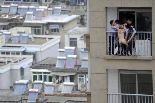 La policía trata de controlar a un hombre desnudo que se disponía a suicidarse saltando por el balcón de su casa, en Hefei, provincia de Anhui, China. El hombre, de apellido Liu, fue finalmente controlado por la policía tras un enfrentamient...
