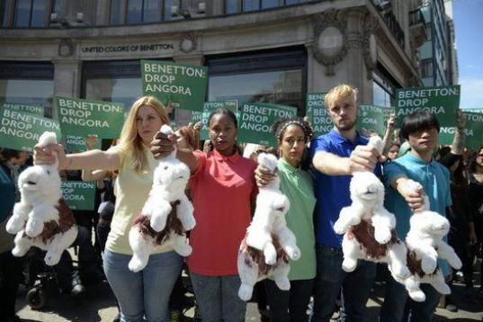Activistas de la organización Personas a favor del Trato Ético a los Animales (PETA en inglés) protestan mientras sostienen conejos de peluche y pancartas en las que se lee 'Benetton: deja la angora' junto a una tienda de la firma de ropa en ...