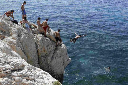 Un hombre salta desde una roca al Mar Mediterráneo durante el verano soleado en Marsella, Francia.