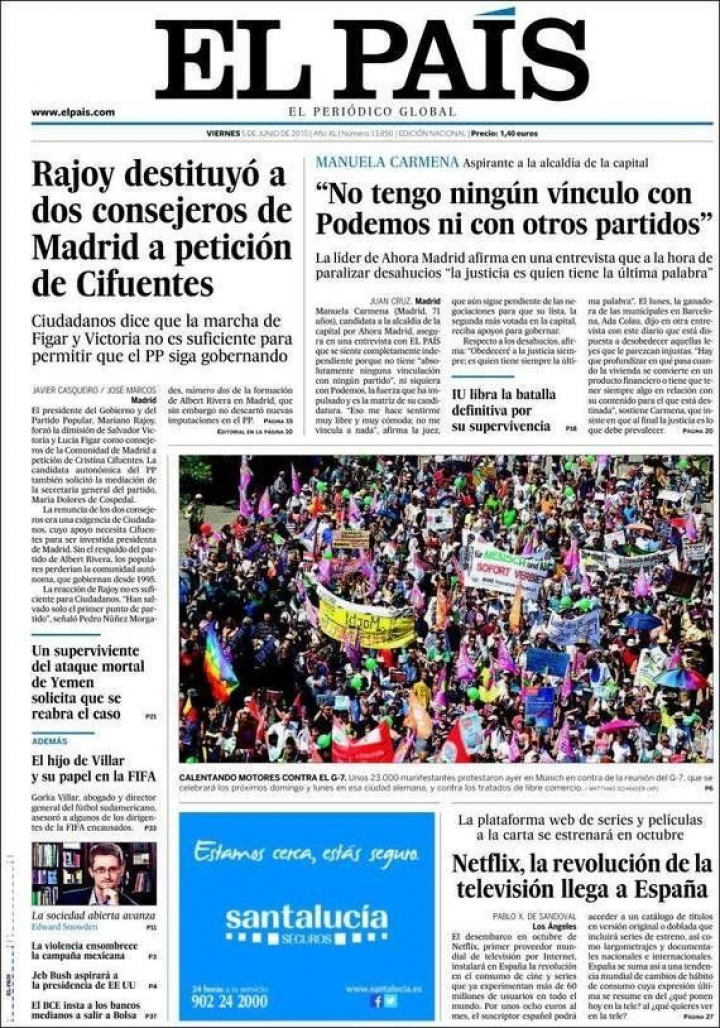 "Rajoy destituyó a Lucía Figar y Salvador Victoria a petición de Cifuentes", explica en su apertura El País, mientras que El Mundo deduce que, de esta manera, la candidata a la presidencia de la Comunidad se impone a Esperanza Aguirre.