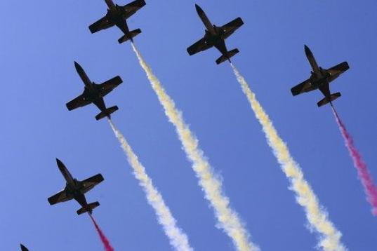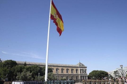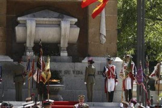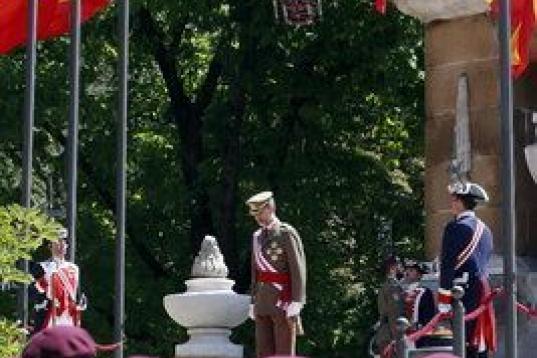 La plaza de la Lealtad de Madrid ha sido el escenario del acto de homenaje a los que dieron su vida por España y de un desfile protagonizado por cerca de 600 militares, en el que no ha faltado el vuelo de la patrulla Águila, formada por siete aviones C-101, dibujando en el aire los colores de la enseña nacional.