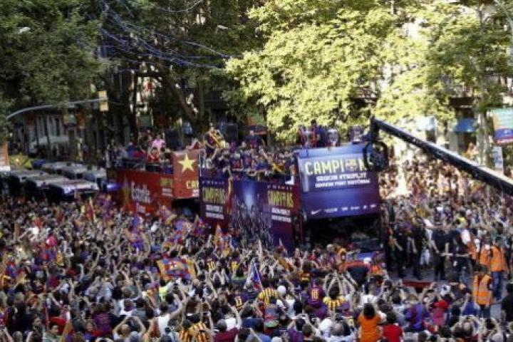 Barcelona es ya una fiesta. Tras la llegada del Barça al aeropuerto, el bus descapotable que les esperaba ya está circulando por las calles, compartiendo con los aficionados la alegría por la Quinta, la nueva Champions.