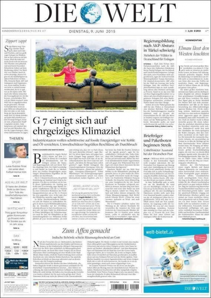 "Ángela Merkel celebra una victoria espectacular" para Die Welt; "la merkelización de la cumbre del G7", señala Handelsblatt, y el Frankfurter Allgemaine saca pecho: "Una nueva economía mundial".