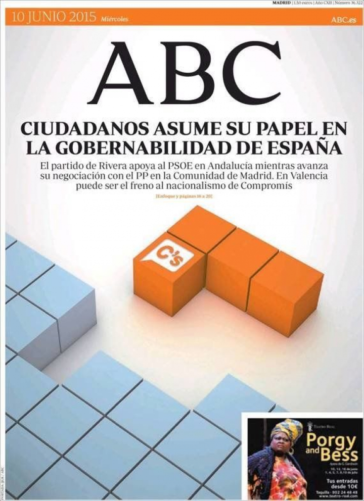 Con estos mimbres, el editorial no podía ser más favorable a la actitud de Rivera, porque "corre el riesgo de presentar una imagen confusa ante sus electores, apoyando unas veces a la izquierda y otra a la derecha"... pero, en realidad, da satisfacción a la mayoría de electores que quieren "un tiempo de pactos y coaliciones". Y, como señala ABC, "Ciudadanos asume su papel en la gobernabilidad de España".