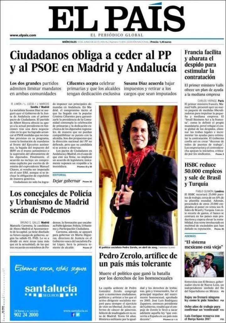 Zerolo se alegraría esta mañana al comprobar que la prensa italiana, como Il Corriere della Sera, destaca que "el Parlamento Europeo reconoce la familia gay al aprobar un informe sobre la igualdad de género". En un mapa de los derechos reconocidos a los gays, Zerolo estaría orgulloso de que España figure como uno de los países más avanzados.