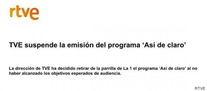 La dirección de TVE ha decidido retirar de la parrilla de programación de La 1 el programa Así de claro presentado por Ernesto Sáenz de Buruaga al no haber alcanzado los objetivos esperados de audiencia, según ha informado la cadena pública.