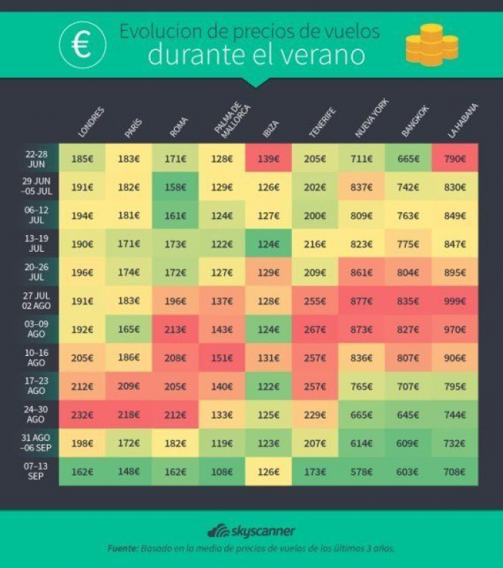 El precio entre la semana más barata para volar —toma nota, es la del 7 al 13 de septiembre— a la más cara —del 27 de julio al 2 de agosto— puede variar un 35%, según calcula el comparador de precios Skyscanner. Así que si te encuentras en el momento de decidir tus vuelos, échale antes un vistazo a esta tabla si quieres intentar ahorrarte unos euros: