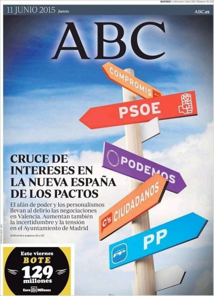 "Caos político en Valencia", advierte en un editorial ABC, que en primera denuncia el "cruce de intereses en la nueva España de los pactos" con la foto de un poste de direcciones en el que PP y Ciudadanos apunta a la derecha; PSOE y Compromís a la izquierda, y el único que apunta hacia atrás es Podemos.
