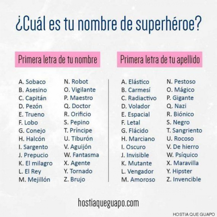 Esta imagen, apenas una sencilla tabla con las letras del alfabeto y unas instrucciones muy básicas, da el nombre que corresponde. Así, las Lauras García serán El Rey Flácido; los Emilios López, Truenos Vengadores; las Cármenes Rubio, Capitanas Biónicas; y los Juanes Díaz, Prepucios Voladores. Sí, en eso está la gracia del juego, en que tu nombre sea equivalente al superhéroe más divertido, chocante y, por supuesto, compartible.