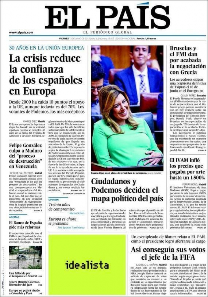 Y esta visión contrasta con el alarmismo que desprenden los titulares de la prensa conservadora española: "Los socialistas entregan Madrid y Valencia a los radicales", señala La Razón, y "el PSOE asume el programa de Podemos para gobernar Valencia", concluye El Mundo; "el PSOE entrega Madrid a Carmena y Podemos aúpa a Bildu en Pamplona" advierte ABC.