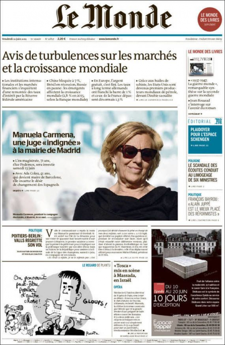 Madrid ya tiene un nuevo icono fuera de nuestras fronteras. Una señora mayor de pelo rubio, grandes gafas de sol y una sonrisa que transmite serenidad. Es el retrato de Manuel Carmena que aparece en la primera del diario Le Monde, que define a la nueva alcaldesa como "la jueza de los indignados".