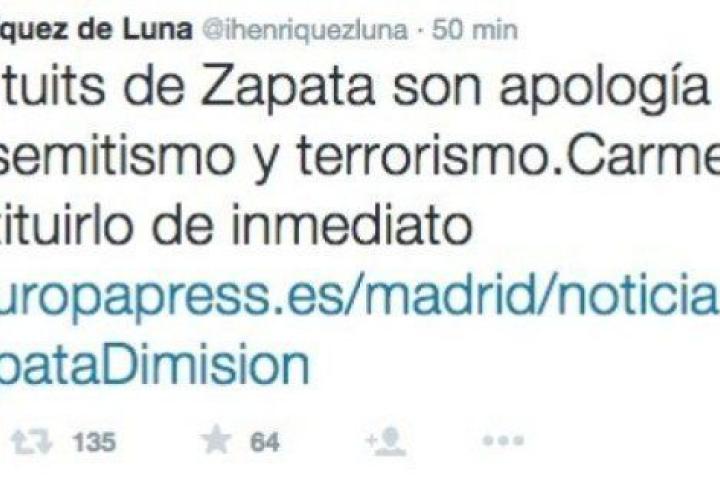 Palabras similares a las usadas por el PP. Su concejal en el Ayuntamiento de Madrid Íñigo Henríquez de Luna ha pedido este domingo a la nueva alcaldesa de Madrid, Manuela Carmena, que destituya al concejal Zapata, "un personaje radical, sectario y cruel".