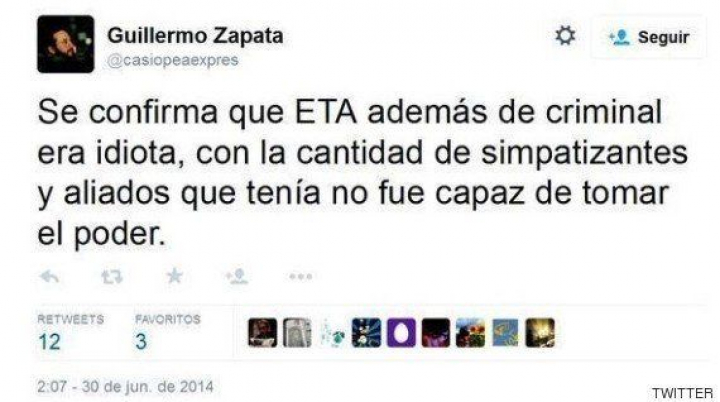 En junio de 2014, Zapata también insertó tuits alusivos a ETA -"se confirma que ETA además de criminal era idiota, con la cantidad de simpatizantes y aliados que tenía no fue capaz de tomar el poder"- y en 2011 hizo chistes con las víctimas del terrorismo: "Han tenido que cerrar el cementerio de las niñas de Alcaser para que no vaya Irene Villa a por repuestos". La periodista y psicóloga también reaccionó en Twitter ante esta alusión: