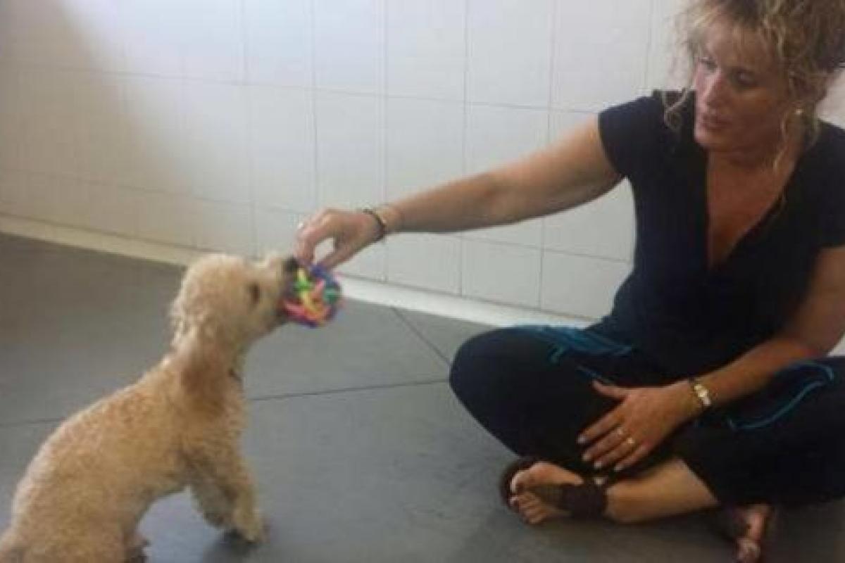 Irene, la dueña, jugando con Buddy en el aeropuerto