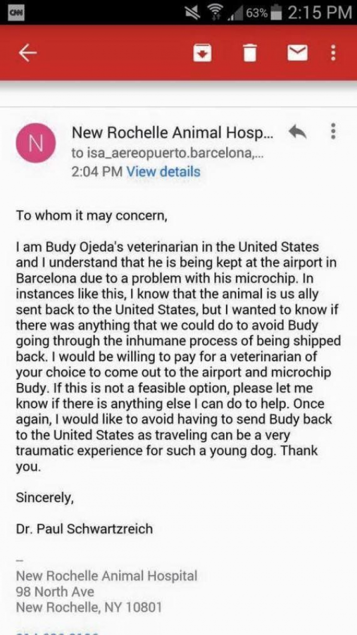 “Lo mandaban desde Nueva York con todos los papeles firmados por los veterinarios de allí. Tenía el chip y había pasado todos los controles americanos”, cuenta su dueña, Irene, a El Huffington Post. Cuando su marido fue a buscar al animal y lo sacaron del transportín para hacer los últimos papeleos, el lector de chip no reconocía el de Buddy, y la encargada del aeropuerto les comunicó que no podían llevárselo.