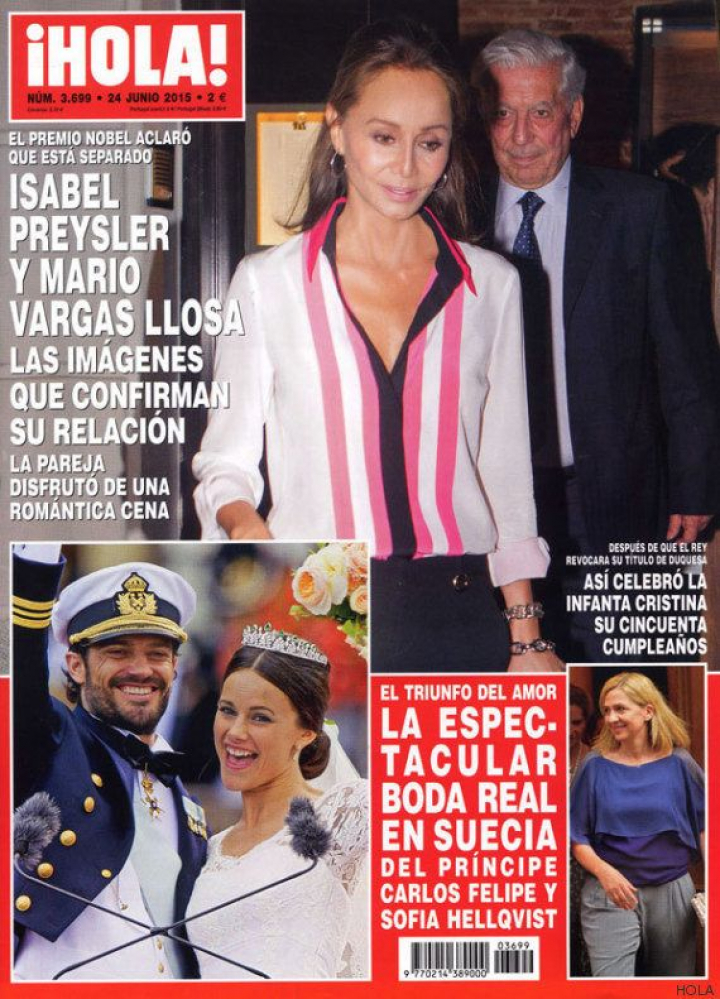 Horas después de la publicación de la primera portada de ¡Hola! que insinuaba una relación entre Isabel Preysler y Vargas Llosa, la mujer de éste envió un comunicado a El País en el que decía lo siguiente: “Mis hijos y yo estamos sorprendidos y muy apenados por las fotos que han aparecido en una revista del corazón. Hace apenas una semana estuvimos con toda la familia en Nueva York celebrando nuestros 50 años de casados y la entrega del doctorado de la Universidad de Princeton. Les rogamos respetar nuestra privacidad”.