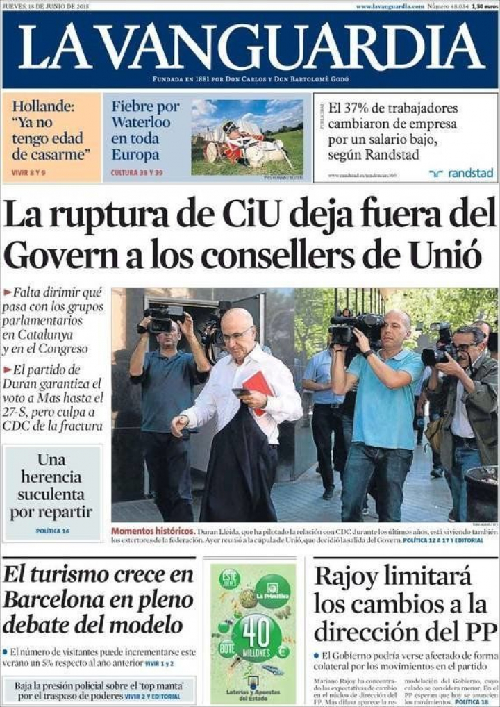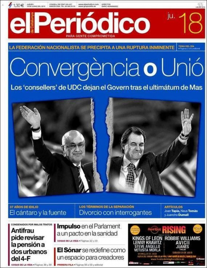 El responsable de que CiU se llame ahora "Convergencia o Unió", como titula El Periódico, es Artur Mas. "La trituradora", como le califica El País en un editorial en el que, no obstante, ve "virtudes clarificadoras" en la crisis porque "Mas podrá componer ahora un gabinete volcado al activismo independentista y Unió, levantar la bandera del catalanismo moderado, integrador y dialogante". David González considera que este "final en diferido" puede suponer que el gobierno catalán sea ahora más estable porque Unió garantiza el apoyo parlamentario y Esquerra, también.
