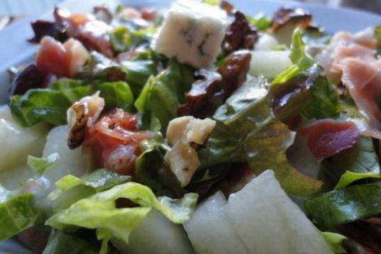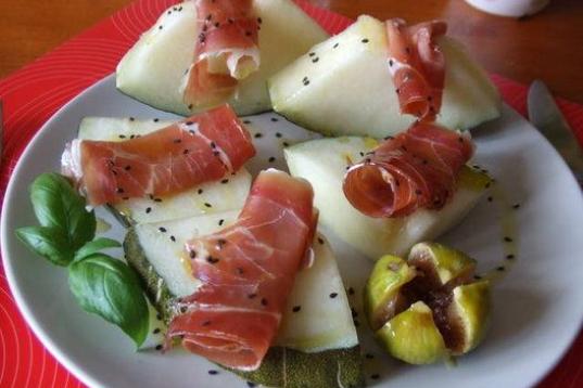 Melón, jamón, queso cremoso, nueces, pimentón picante y sal. Así de sencillo y de elegante.