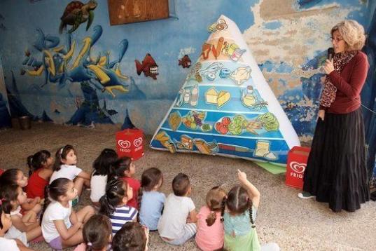 El centro tiene las paredes del patio llenas de murales que representan el fondo del mar. Los niños atienden, sentados en el suelo y rodeados de ballenas, tortugas y pirañas, a Diana Roig, una nutricionista de la compañía que les explica con varios ejemplos la pirámide nutricional. “Hemos hecho el taller con varios grupos de edades. Se trataba de que viesen en qué consiste una alimentación equilibrada”, cuenta la experta a El Huffington Post. “Algunos de los chicos no comen nada más en todo el día al salir del colegio, por eso queremos explicarles la importancia de la alimentación”, dice Anaïs, organizadora del evento.