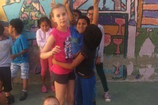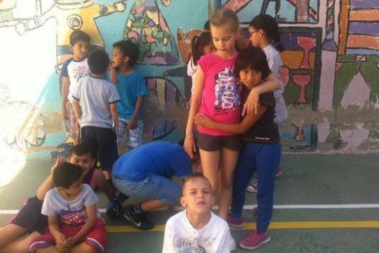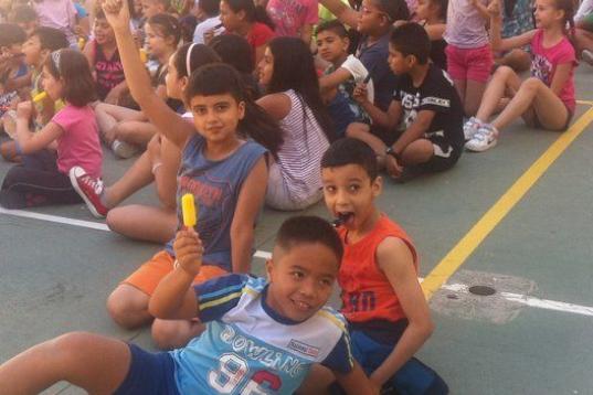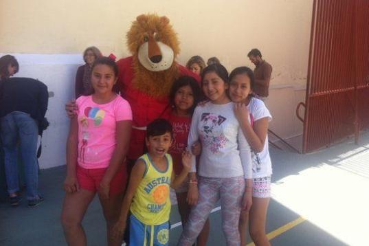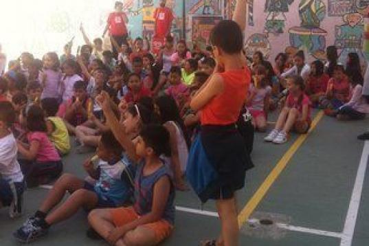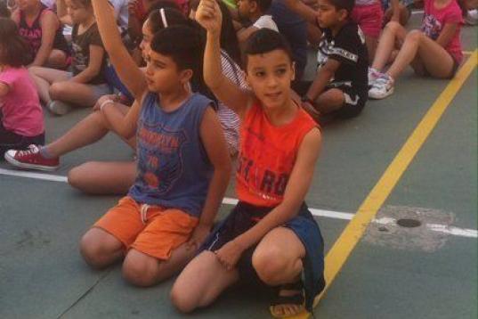 Llega el momento de repartir helados. Los alumnos, colocados en el centro del campo de baloncesto, no paran de gritar y jugar emocionados. Los mayores cuidan a los más pequeños y les chocan los cinco, señalándoles que se sienten a su lado. Hay helados de tres colores y los niños tienen que adivinar de qué sabor es cada uno, mientras un animador disfrazado les pregunta. “Joe, como corren todos. Parecen unos locos”, comenta un chico de unos ocho años que está apoyado en la pared. “Yo no puedo porque ya me he comido el helado, pero me lo estoy pasando bomba”, añade.