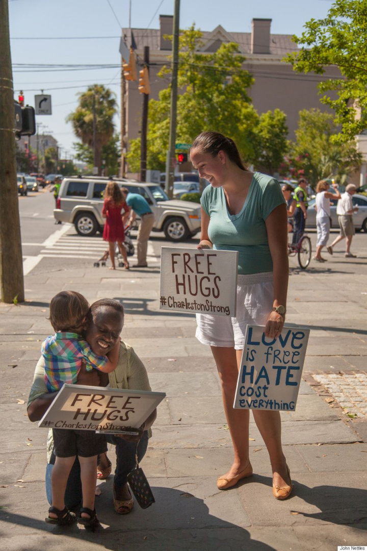 Nettles explicó a nuestros compañeros de The Huffington Post en Estados Unidos que tomó la fotografía este domingo, cuando estaban caminando por las calles de Charleston. En un momento dado, cuando se preparaban para cruzar, se encontraron con Taylor y su amiga Beth, que llevaban carteles con los lemas "abrazos gratis" y "Charleston fuerte".
