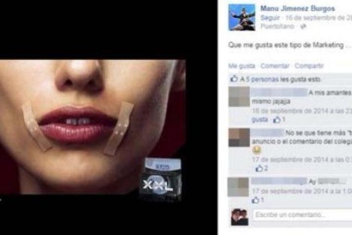 La plataforma se refiere en concreto a una actualización de Jiménez Burgos en su perfil de Facebook del pasado mes de septiembre. En ella aparece un anuncio de unos preservativos talla XXL en el que se ve los labios de una mujer con tiritas a ambos lados. El concejal acompañó esa foto con un comentario de cosecha propia: "Que me gusta este tipo de Marketing".