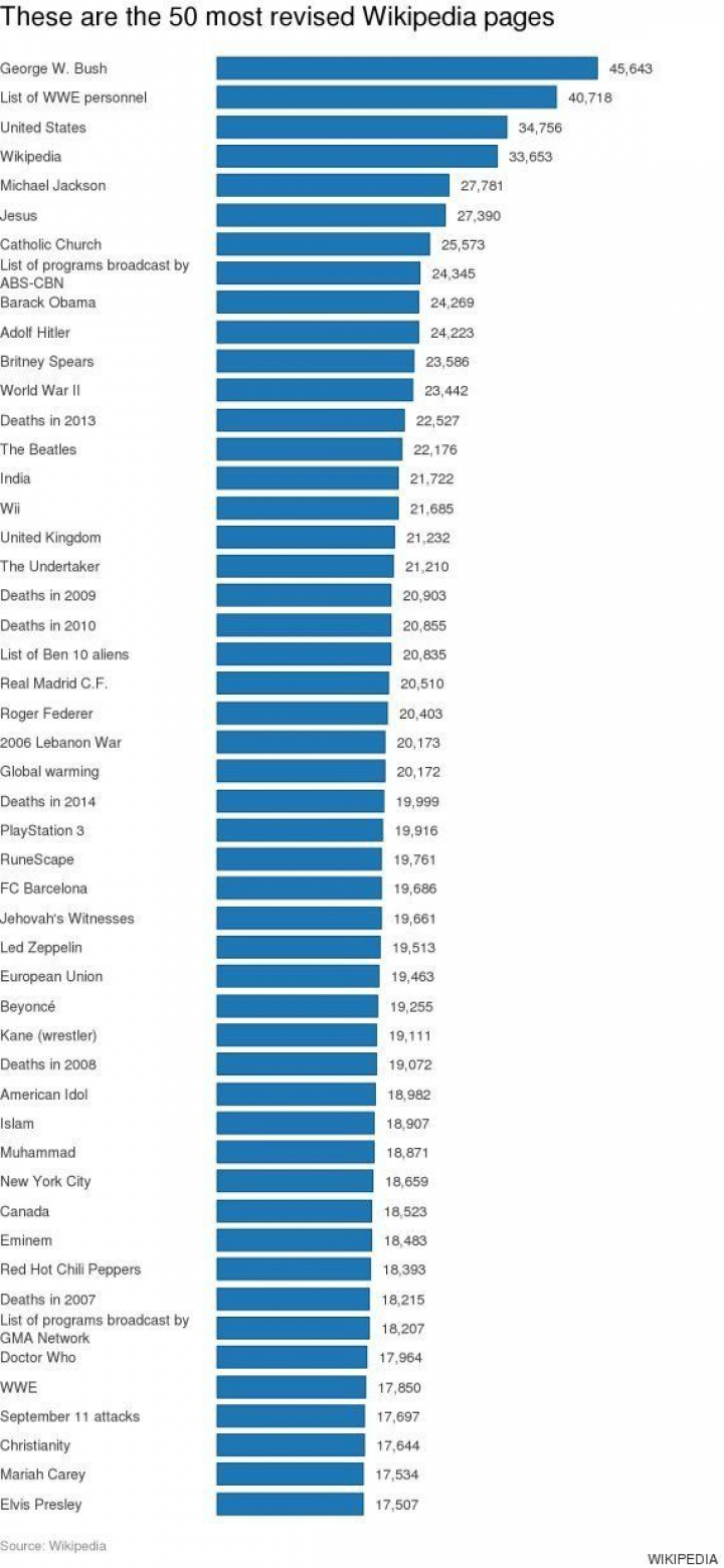 La enciclopedia interactiva ha registrado las cincuenta búsquedas que han sido más editadas, encabezando la lista 'George W. Bush', seguido del 'personal de WWE' y de los 'EEUU', acabando la lista con la 'cristiandad', 'María Carey' y 'Elvis Presley', según publica el diario Independent.