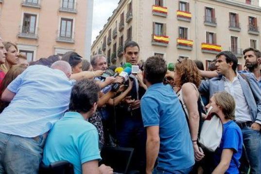El secretario general del PSOE, Pedro Sánchez, atiende a los medios de comunicación a su llegada a la capilla ardiente de Pedro Zerolo, miembro de la Ejecutiva del PSOE y secretario de Movimientos Sociales, fallecido esta madrugada en su casa ...