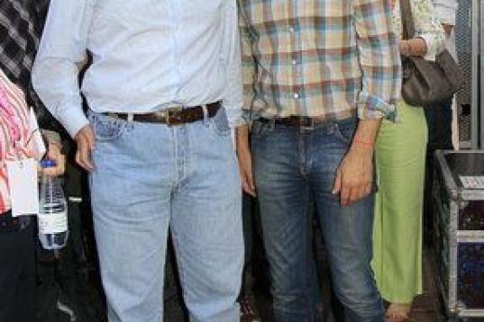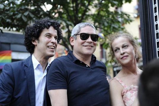 Jesús Santos (i), marido de Pedro Zerolo, miembro de la Ejecutiva del PSOE y secretario de Movimientos Sociales, fallecido esta madrugada en su casa de Madrid, junto a las hermanas de Zerolo, ante la capilla ardiente instalada en el patio de cr...