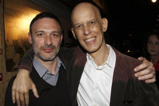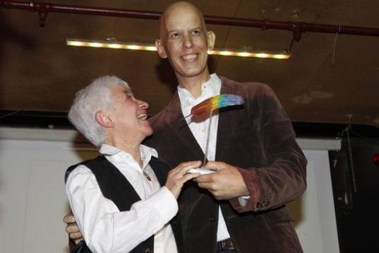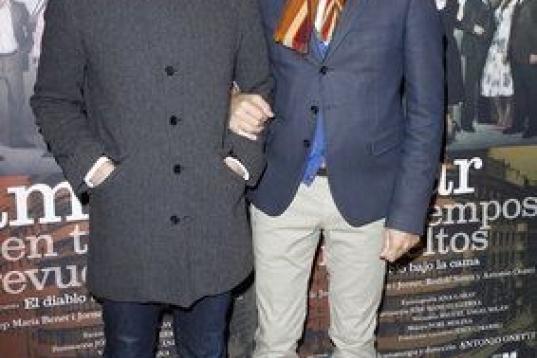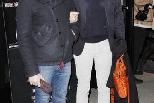 Jesús Santos (i), marido de Pedro Zerolo, miembro de la Ejecutiva del PSOE y secretario de Movimientos Sociales, fallecido esta madrugada en su casa de Madrid, en la capilla ardiente instalada en el patio de cristales de la Casa de la Villa.
