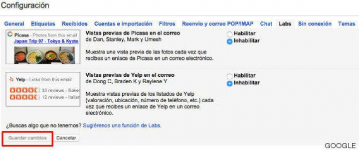 1. Accede a tu cuenta de Gmail, haz clic en la rueda dentada (arriba a la derecha) y selecciona Configuración. A continuación, abre la pestaña Labs.