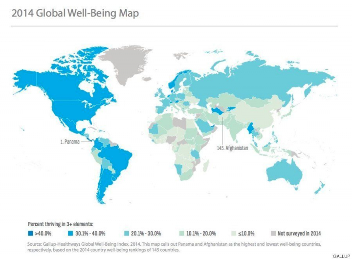 Esta es la clasificación de países más y menos felices, según Gallup, que abajo puede verse en un mapa. Panamá es el primero, mientras que en la cola, en el puesto 145, se encuentra Afganistán. El puesto 135 lo ocupa Zimbabue, el 136 Ghana, el 137 Haití, el 138 Benín, el 139 Costa de Marfil, el 140 Congo, el 141 Túnez, el 142 Togo, el 143 Camerún, y el 144 Bután.