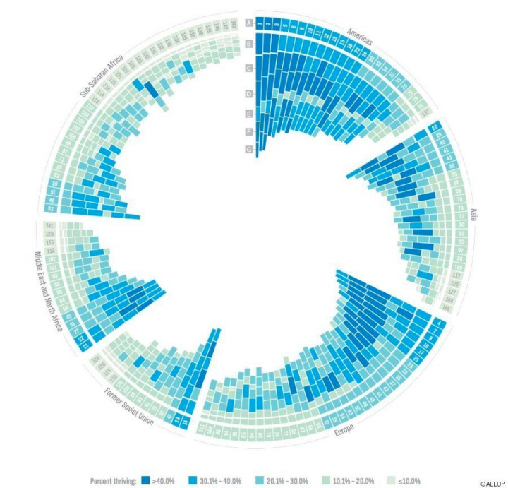 Según el informe (que se puede consultar aquí), la felicidad puede medirse —o al menos ellos lo hacen— mediante cinco características que se han tenido en cuenta en 145 países en los que se ha entrevistado a 146.000 personas: el cumplimiento de propósitos (que te guste lo que haces cada día y estar motivado para alcanzar tus metas), la importancia de lo social (tener apoyos, cariño), la situación financiera (manejar tus finanzas para tener menos estrés y más seguridad), la comunidad (que te guste donde vives, sentirte seguro y enorgullecerte de tu comunidad) y la condición física (tener buena salud y energía para hacer las cosas cada día). Según el nivel al que estén esos cinco elementos en cada país se realiza la clasificación.