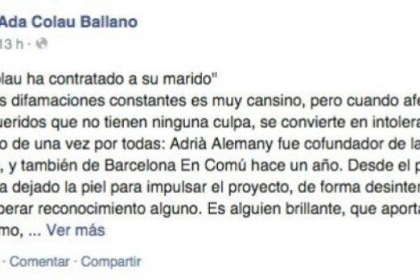 "Ha sacado tiempo de debajo las piedras para ayudar a que ganáramos las elecciones", ha explicado Colau, y ha afirmado que, tras la victoria electoral, BComú ha aumentado sus responsabilidades y tareas, por lo que la coordinadora de la organización, un cargo que no ostenta la alcaldesa, ha decidido ofrecer a Alemany un trabajo remunerado.