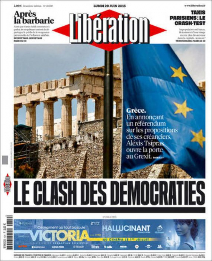 En Libération van del negro al rosa en cuatro escenarios. Para los mercados financieros, en el negro las bolsas apostarán desde hoy "por una zona euro condenada a la explosión interna". En el rosa, se mantendrá la calma porque el Gréxit no es inmediato y los bancos de la zona euro están vacunados ante una eventual quiebra de los griegos.