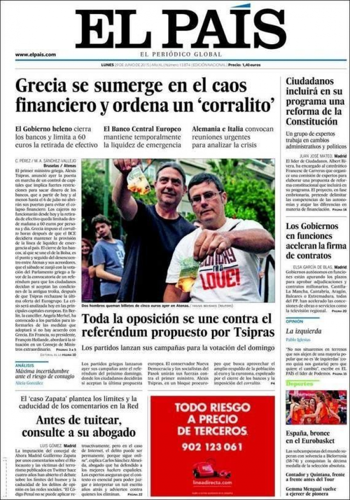 En cualquier caso, sentencia, "los griegos irán a votar una propuesta que este martes dejará de existir". Como inicia Claudi Pérez su crónica en El País: "Sin bancos no hay paraíso: un país no puede vivir sin su sector financiero". En su editorial, este diario considera que todavía hay una salida y por ese motivo, hace un llamamiento a los griegos a que "derroten al Gobierno que les conduce a la pesadilla de la quiebra en el referéndum del próximo domingo".