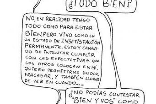 No parece casual que las figuras humanas que aparecen en muchas de sus viñetas se hagan infinitamente pequeñas ante los enormes bocadillos que representan sus pensamientos y dudas. Exteriorizar de forma gráfica y amena los asuntos que rondan por su cabeza es el modo del uruguayo de liberar de su sistema interno cosas que considera que deben salir.