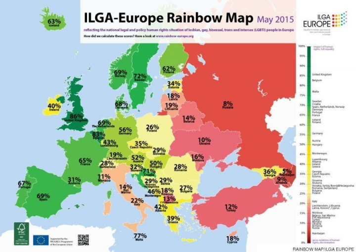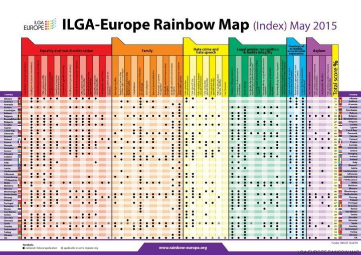 Cartografía de los derechos de las personas LGTBI en Europa, con una nota media de acuerdo a distintos indicadores, como el nivel de igualdad y no discriminación, familia, libertad de reunión, etc.