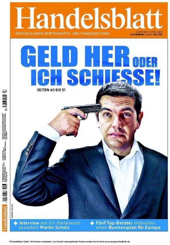 Se confirmará así la portada del Handelsblatt, que muestra a Alexis Tsipras con una pistola apoyada en la sien, al tiempo que advierte: "El dinero, o disparo".