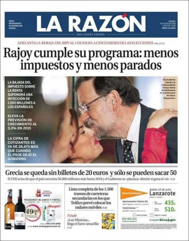"No es producto de una conjunción astral ni de palabras mágicas". La frase es del presidente del Gobierno y ABC la lleva a su primera página para reseñar que Rajoy se reivindica. Una valoración solo superada por La Razón: "Rajoy cumple su programa: menos impuestos y menos parados". Ambas frases podrían figurar en un cartel electoral porque, como resume El Periódico en su apertura, "Rajoy rebaja el IRPF antes de las elecciones".