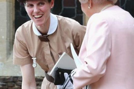 El carrito "vintage" ya fue usado para llevar a dos de los hijos de la reina, de 89 años de edad, quien optó hoy por un abrigo y sombrero, ambos de color rosa, diseñados por Angela Kelly.