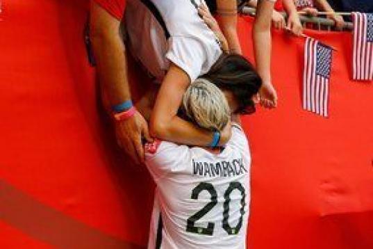 Las jugadores estadounidenses celebraban en el césped el triunfo y la capitana y una de las mejores jugadores del mundo (fue Balón de Oro en 2012), se acercó a la grada y compartió su alegría con su mujer, Sarah Huffman, con la que se fundió en un emotivo abrazo y se dio un beso.