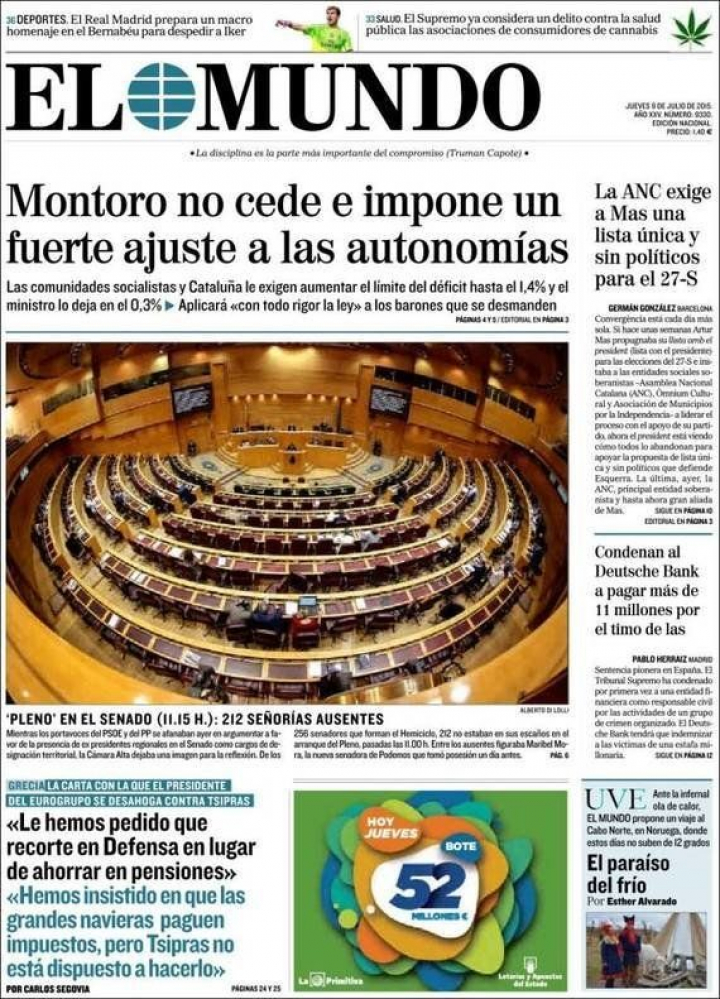 Estas tiranteces se suman a las que se viven de manera interna en Cataluña, que, según El Periódico, vive un "enredo soberanista" porque "Convergencia se resiste a que Mas quede fuera de la lista unitaria sin políticos para el 27S". Y para conseguirlo, leemos en El País: "Mas amaga con no convocar elecciones si no se aceptan sus requisitos".