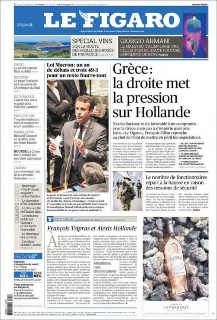 "En Europa, Tsipras divide a la izquierda", analiza Libération en dos páginas. "Si desde Madrid a París las izquierdas radicales respaldan sin reservas a Syriza, los socialistas están divididos". En Francia, Valls ha evitado la división al asegurar que no habrá Gréxit; en Alemania, sin embargo, el SPD ha marcado distancias con Tsipras para evitar la ruptura en el gobierno de coalición, y en Italia, Renzi ningunea a los partidarios del "no" en el referéndum.