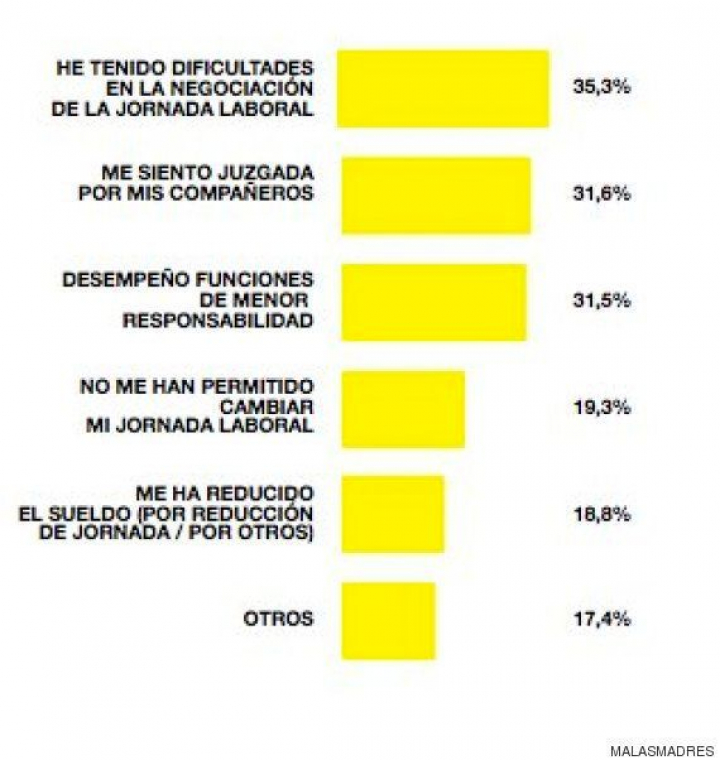 El 50,7% de las encuestadas que trabajan mencionan haber tenido experiencias negativas desencadenadas por la maternidad y 5 de cada 10 asume que ha cambiado algún aspecto de su trabajo por ser madre. Esto coincide, dice el estudio, con datos como los de la Organización Internacional del Trabajo (OIT), que sostiene que estas mujeres cobran un 17% menos que los hombres y un 5% menos que las mujeres no madres.
